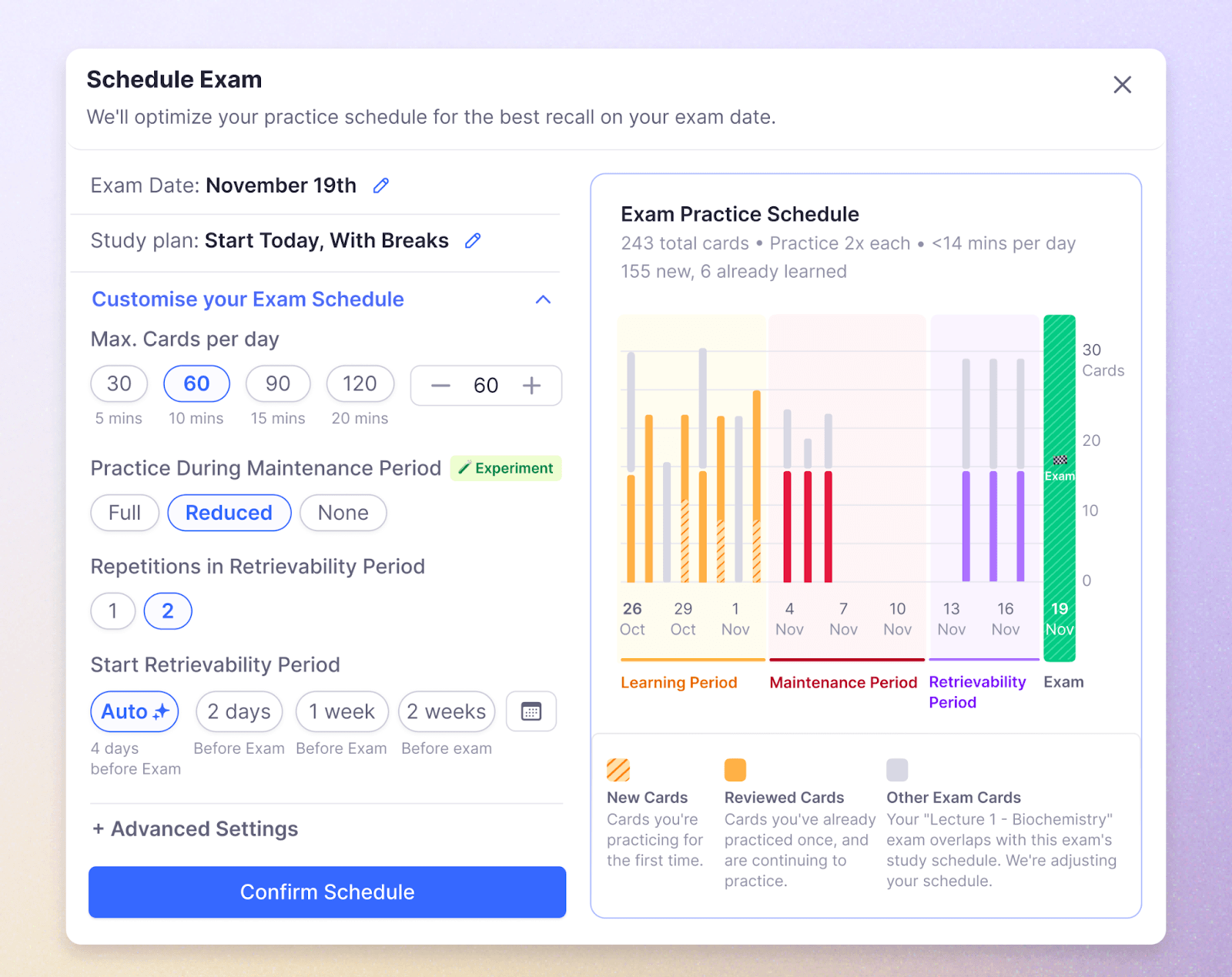 - Exam scheduler: In RemNote, you can simply set your exam date and pick a study plan, and the app then adjusts your daily practice to ensure you are maximally prepared for test day.