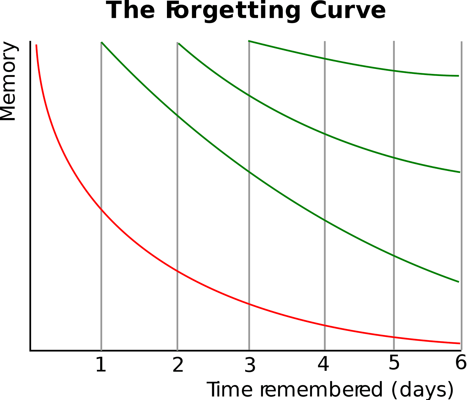 When you learn something new, the likelihood that you will forget most of it is very high in the beginning. As time passes, you keep forgetting the rest of it, but at a slower pace.