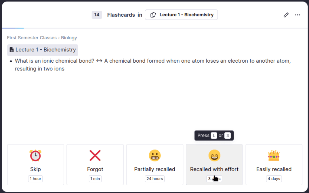 - Recalled with effort: Choosing this option means you remembered the answer, and you had to think about it for a moment, but didn’t struggle. The next interval comes after 3 days.