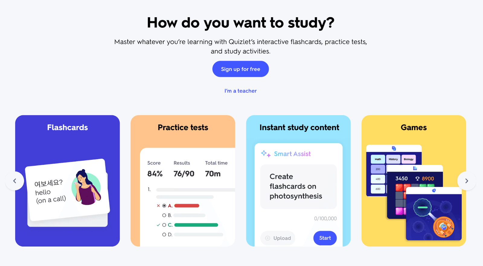 Quizlet is a learning platform for students to learn through flashcards and games.
