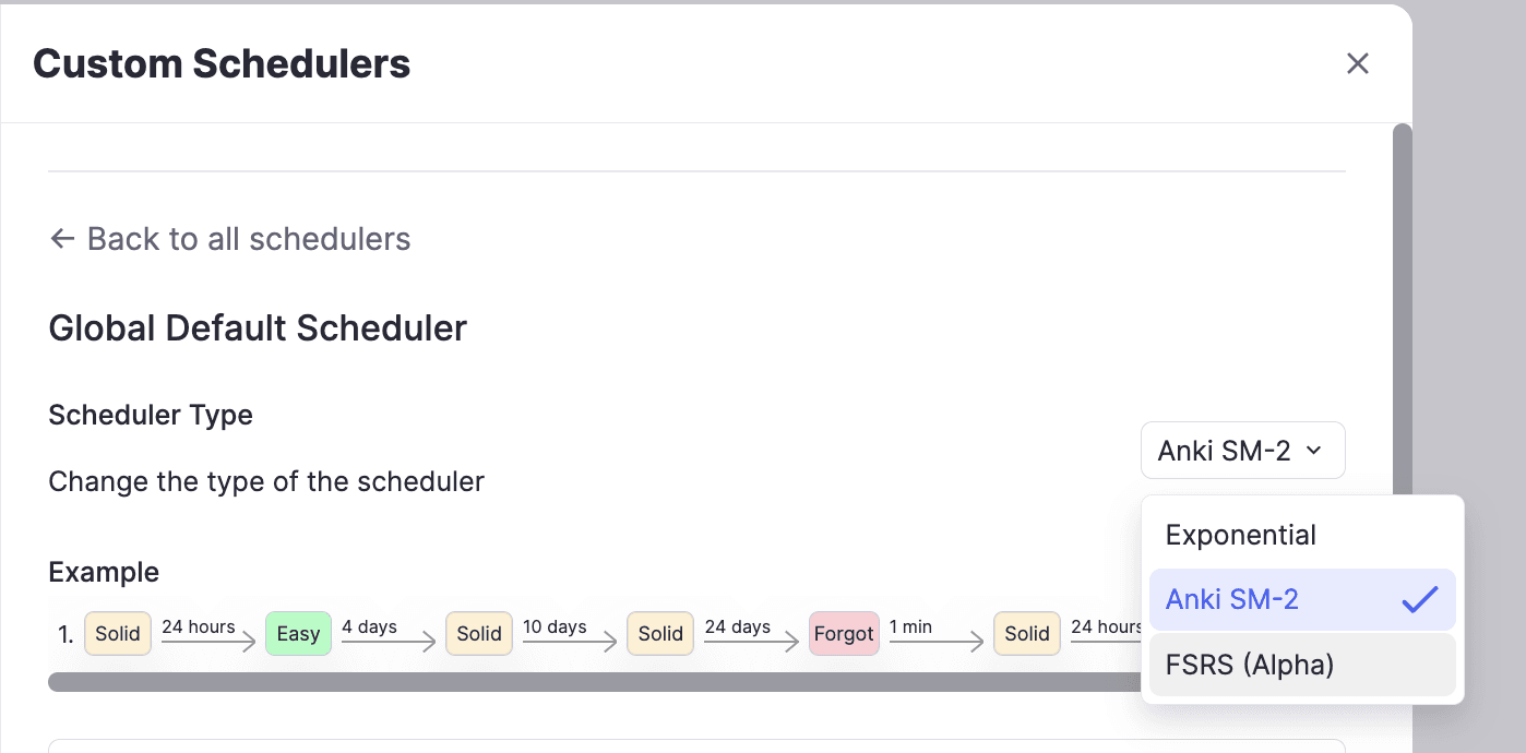 | Algorithm | FSRS + SM-2 | SM-2 + FSRS | SM-2, SM-17, SM-18, SM-19 | Memory Score (proprietary) |